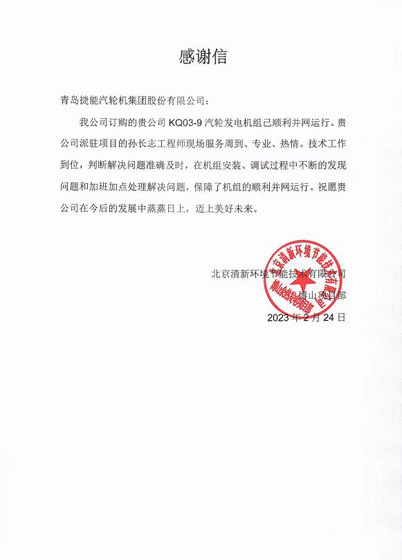 我公司供北京清新環(huán)境技術(shù)股份有限公司淄博金晶集團KQ03-9#余熱發(fā)電機組項目于2月21日順利并網(wǎng)發(fā)電,用戶(hù)特發(fā)來(lái)感謝信表示感謝。